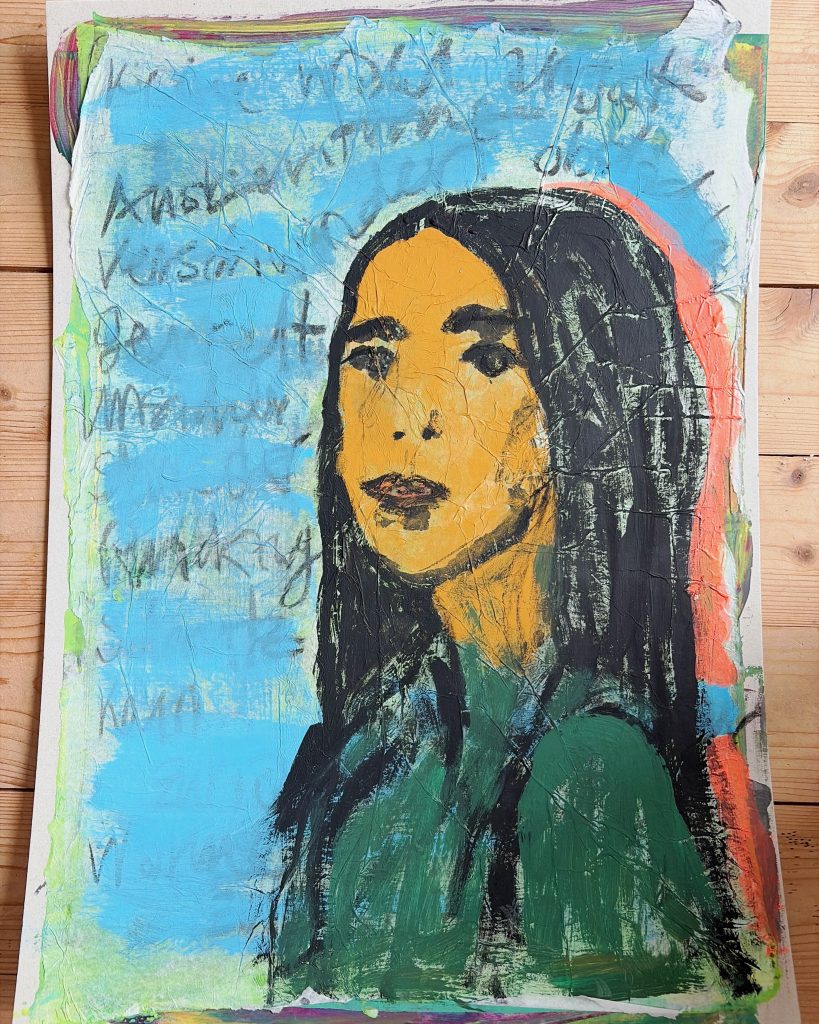 Beim farbigen Bild oben habe ich eine eine Mixed Media-Stapelart-Technik im Unterricht Maltechniken ausprobiert (inspiriert von @claudiastapel_art). Es geht darum, ganz viele Schichten zu gestalten und diese immer wieder zu übermalen. Ich hatte nicht sehr viel Geduld, aber dieses Bild erinnert mich daran, dass ich mich noch in diese Technik vertiefen möchte. Gleichzeitig habe ich das Thema der obdachlosen Frauen für mich verarbeitet.